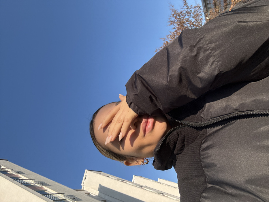 A low-angle, close-up photograph captures a female individual outdoors in an urban area of Dresden, Germany, under bright sunlight. The subject, positioned in the lower frame, wears a black puffer jacket with a ribbed collar and a visible zipper. Her right hand, featuring light-polished, almond-shaped fingernails, is raised to cover her eyes and upper face, shielding them from direct sun exposure. Sunlight illuminates the visible portions of her tanned skin, including her left cheek and slightly parted lips. A gold-toned hoop earring is visible in her left ear, and light-colored hair is pulled back from her face. The background consists primarily of a clear, brilliant blue sky in the upper frame. To the upper left, two modern, multi-story buildings with light-colored facades and dark horizontal accents are partially visible. On the right side of the frame, a bare-branched deciduous tree is partially visible against the sky.