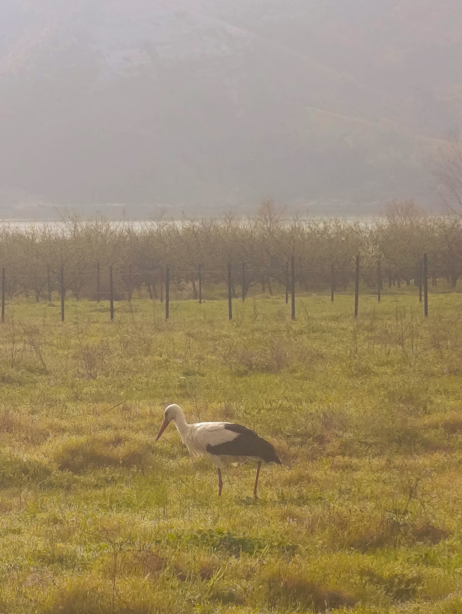 A stork stands in a grassy field in Shiroko pole, Bulgaria. Rows of young trees, supported by posts, stretch into the distance. A hazy mountain or hill is visible in the background. The weather appears overcast or foggy.