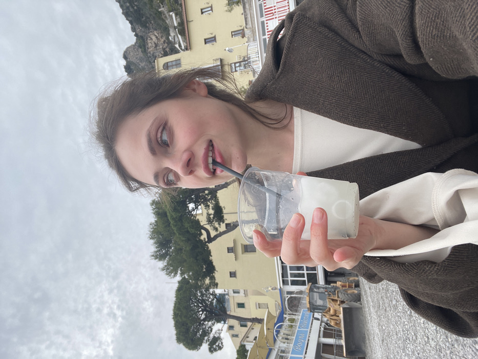 The scene captures a young adult female on a pebbled waterfront. The location, identified by the prompt as Pogerola, Italy, features characteristics of a coastal town. The female subject, positioned in the foreground with her gaze directed slightly to the upper left, displays a subtle smile. She possesses brown hair, light complexion, and wears a dark brown collared coat over an off-white long-sleeved shirt. Her right hand holds a clear plastic cup containing a pale, opaque liquid with white solids, from which she sips through a dark-colored straw positioned in her slightly parted lips. The background shows a wide expanse of pebbled ground. To the left, a yellow front-end loader is visible. Adjacent to the loader is a white building with blue awnings, featuring a sign that reads "Bagni." Further back, multiple light-yellow buildings with balconies are constructed into a steep, vegetated hillside or cliff face. Green trees are interspersed on the hillside. The sky above is uniformly overcast. No other individuals are present.