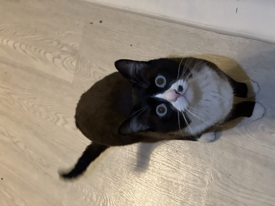 - "A tuxedo cat with striking blue eyes looks upward" by FM-bKuIe2, licensed under CC BY 4.0