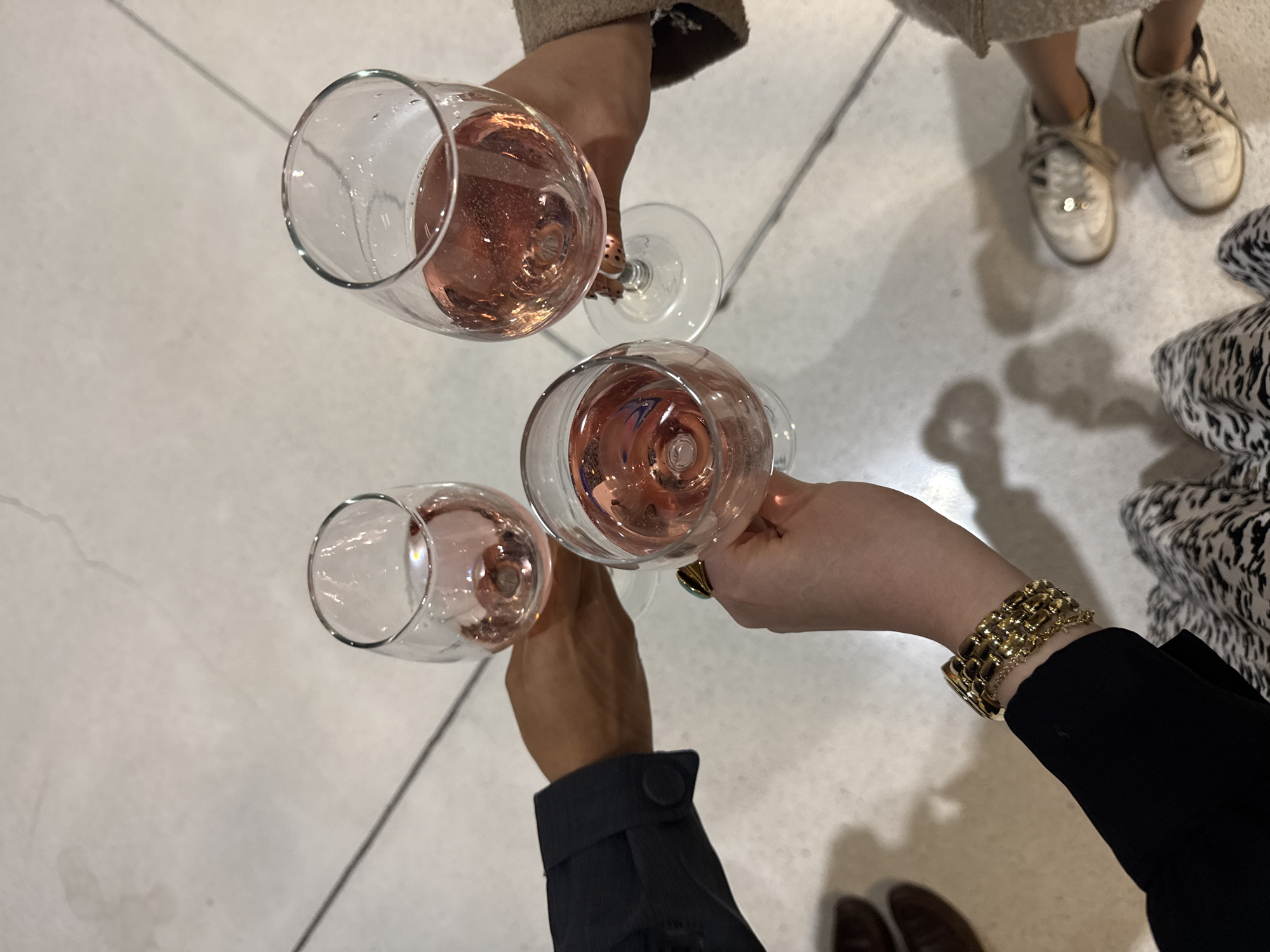 An overhead view in Ciudad López Mateos, Mexico, depicts three individuals engaged in a toast. Three clear stemmed wine glasses, each containing a translucent, sparkling rose-colored liquid, are held aloft and positioned close together. Bubbles are visible within the liquid of each glass. From the left, a dark-skinned arm clad in a dark blue or black long-sleeved garment with a buttoned cuff holds one glass. A brown shoe is partially visible on the light-colored floor below. At the bottom center, a light-skinned arm, wearing a black long-sleeved garment, displays a gold-toned link watch and a thin gold-toned chain bracelet on the wrist. A ring with a prominent turquoise or dark blue stone is worn on a finger of this hand. The individual's lower body is partially visible, clad in patterned (black and white, possibly zebra print) fabric. On the right, another light-skinned arm, covered by a light brown or beige textured long-sleeved garment, holds the third glass. Fingernails on this hand feature a light base with dark spots. Below this individual, a pair of light-colored sneakers with dark laces are visible on the floor. The floor surface is a light gray or off-white material, possibly concrete or large tiles, showing subtle discoloration and faint linear seams. Shadows from the people and glasses are cast onto the floor. The scene captures the moment of three people clinking glasses in celebration or camaraderie.