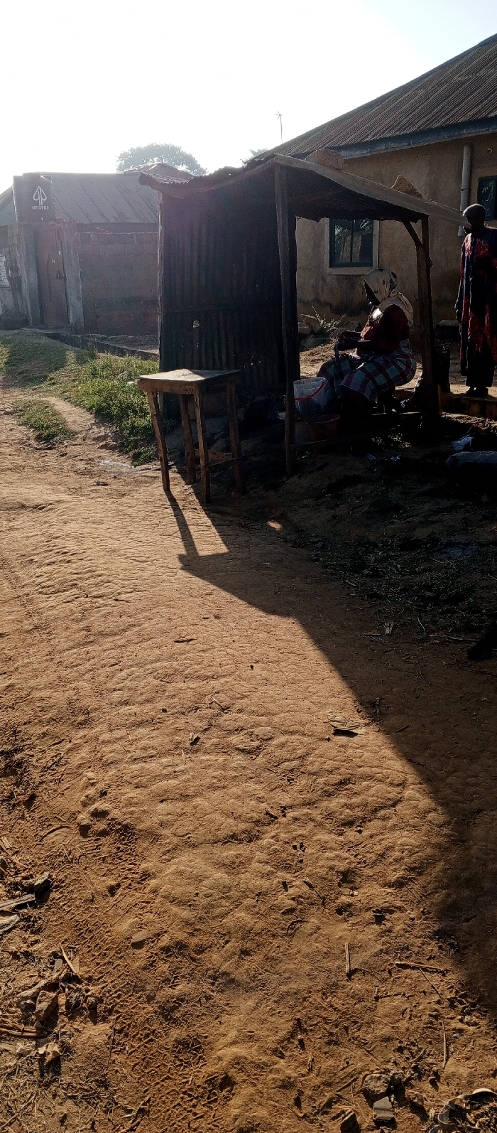 A weathered scene unfolds. A simple, wooden stool casts a long shadow across a dry, dusty ground. Behind it stands a makeshift structure of corrugated iron and wooden supports, sheltering a seated figure engaged in an unseen task. Another person, clad in patterned fabric, stands near the shelter's edge. In the background, two buildings suggest a rural or impoverished area. The overall impression is one of humble existence and everyday activity in a sunlit setting.