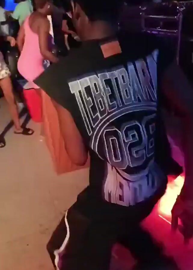 A man in a black tee shirt with the words “Tebe Barat 026 Mentality” dances in a crowded night club. He is dark-skinned, has a muscular build, and holds a green object in his right hand. In the background, several people dance and walk around him. The club has pink, purple, and blue lighting, and there is a sign that reads “NIGHT LIFE.” The floor appears to be sandy.