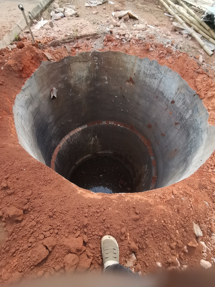 A large, circular well is the focal point, surrounded by reddish-brown soil. The well's inner walls are gray and appear to be made of concrete. A small amount of dark water is visible at the bottom. The surrounding ground is uneven and rough, with scattered debris. A person's foot, clad in a gray shoe, is visible in the lower-right corner. Bamboo poles lie near the upper right edge. A metal object is seen leaning at an angle near the upper-left corner.
