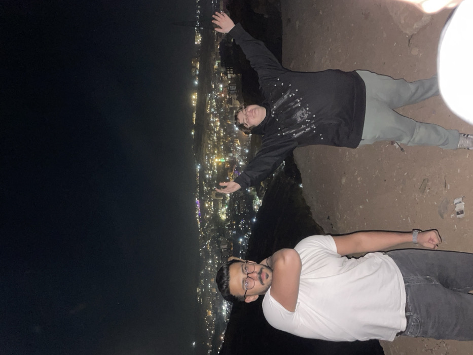 Two males are depicted standing on a barren, reddish-brown hillside at night, overlooking a brightly illuminated cityscape. The scene's environment is consistent with an elevated position within or adjacent to Dummar Municipality, Syria, offering a panoramic view of urban lights and distant hills under a dark sky. The male on the left, with dark hair, a beard, and eyeglasses, is dressed in a plain white short-sleeved t-shirt and dark-colored pants, wearing a watch on his left wrist. He stands with his right arm bent, hand resting behind his neck, looking off-camera to his right with a neutral expression. The male on the right wears a dark hooded sweatshirt featuring reflective, possibly silver-colored, embellishments on the chest, and light-colored pants. He stands with both arms outstretched and raised, palms open, looking directly towards the camera with a cheerful expression. The immediate foreground shows exposed dirt and scattered debris, including several discarded cigarette butts. The midground slopes sharply downwards towards the city, which is extensively illuminated by numerous lights from buildings and infrastructure, indicating a densely populated area. Distant hills are faintly visible against the dark horizon beyond the urban sprawl.