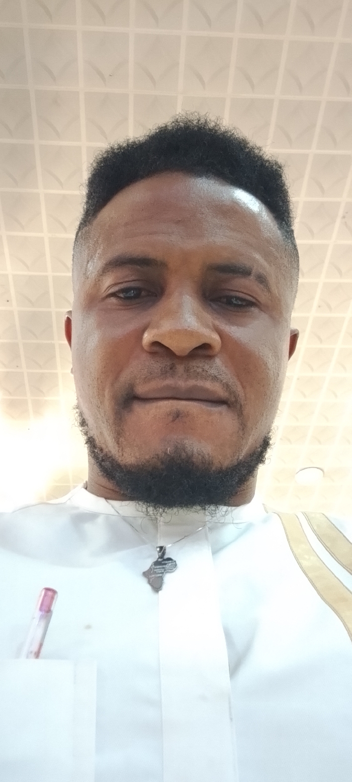 A headshot portrait of an adult male of African descent is captured in an indoor setting in Yelwa, Nigeria