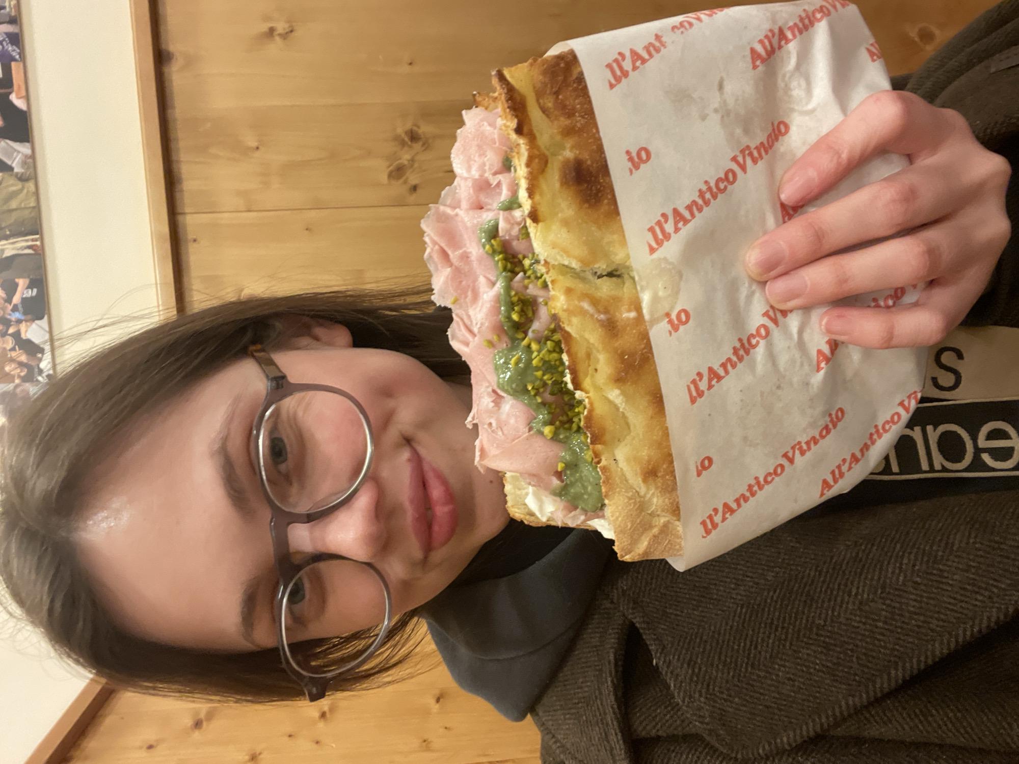 A young adult female, wearing dark-rimmed round spectacles, is centered, smiling directly at the camera. She has dark hair and is dressed in a dark hooded garment under a dark brown, possibly herringbone-patterned coat. Both hands support a large, open-faced sandwich, likely focaccia, wrapped in white paper. The wrapper is printed with repeated red text, clearly showing "Il'Antico Vinaio." The sandwich is generously filled with layers of thinly sliced pink meat, a bright green sauce or spread, scattered green pistachios, and a white creamy spread. The background consists of vertical wooden wall paneling, topped by a lighter, cream-colored wall. A partial image depicting multiple individuals is visible on the upper right section of the wall. This scene is situated within an All'Antico Vinaio establishment in Naples, Italy.