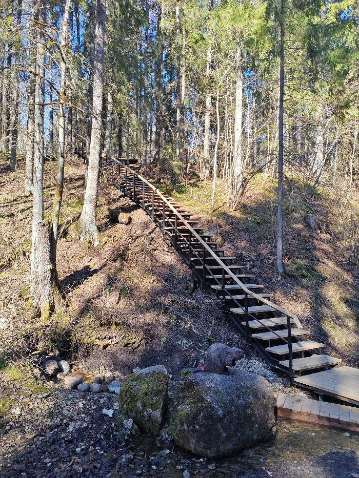 This image depicts a steep, metal and wooden staircase ascending a forested hillside in Lopukhinka, Russia. The staircase features black metal stringers and handrails, with light-colored wooden treads, extending from the lower right foreground upwards into the tree line. At the base of the staircase, a small stream or water channel flows alongside a wooden platform. Situated on a large, moss-covered boulder adjacent to the stream is a grey, statuary figure resembling a beaver, depicted in a seated position and appearing to hold a red-handled tool, possibly an axe or spade, in its forepaws. The surrounding environment consists of dense forestation, predominantly tall coniferous trees and several bare deciduous trees, indicative of late winter or early spring. The ground is covered with dried leaves, sparse undergrowth, and exposed soil. Sunlight casts distinct shadows across the hillside, suggesting clear weather conditions. No human subjects are visible in the scene.