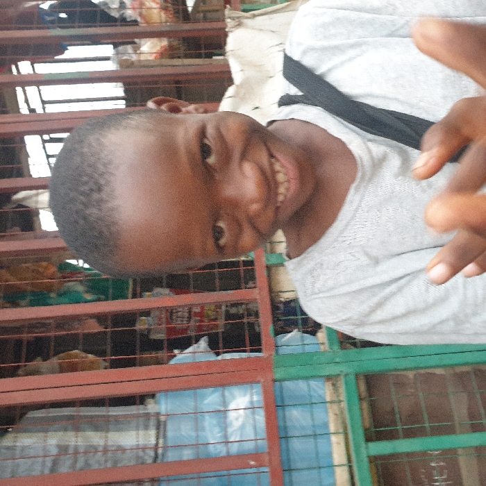 A young person with dark skin smiles broadly towards the camera, their fingers slightly blurred as they extend into the frame. They are wearing a light gray shirt with a black strap visible across the shoulder. Behind them is a multi-tiered metal cage structure, partially filled with items including bags. The setting appears to be an indoor space, possibly a market.