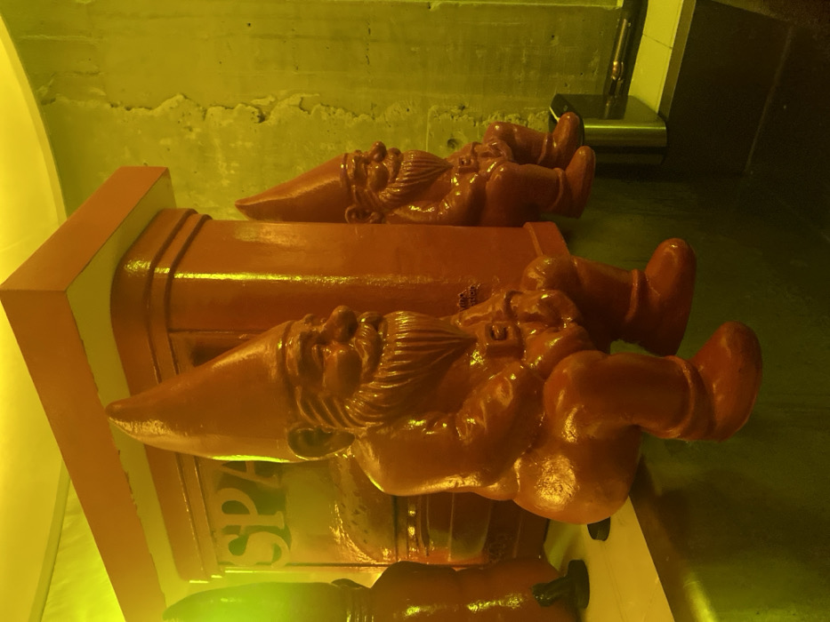 Two orange gnome statues rest atop a matching orange structure. The gnomes wear pointed hats, have long beards, and appear to be lying down. One gnome is directly behind the other. The structure features the partially visible word "SPA." A wall with a textured surface forms the backdrop, and a metallic object is visible behind the gnomes on the right. The overall lighting gives the scene a yellow cast.