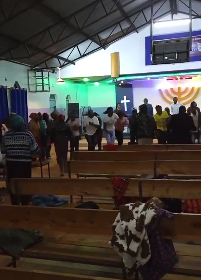 group of people dancing in a church. The interior of the church has wooden pews in rows. Some blankets and clothes are on the pews. The stage has a white cross on either side of a golden menorah. There is also a television hanging above the stage. The people are dancing facing the stage. The lighting is varied, with green, blue, and purple lights on the stage. Some people are dressed casually. The church has a metal ceiling and appears to be well lit.