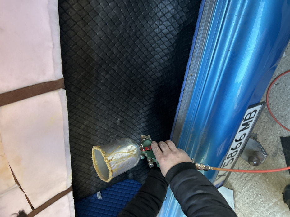 A close-up, high-angle shot depicts a person's hands operating a spray gun near the rear of a blue vehicle. The hands, wearing dark long-sleeved clothing, hold a green and metallic spray gun with a top-mounted reservoir. The reservoir contains a viscous, yellowish-brown substance, likely adhesive, which is visibly dripping down its exterior. An orange air hose is connected to the bottom of the spray gun, leading to a red coiled hose on the concrete ground. Above the blue vehicle panel, which appears to be a rear bumper or side, a black diamond-quilted lining is visible, likely part of the vehicle's interior or trunk. To the left within this area, a section of blue quilted material is also present. Above the black lining, a white fabric or insulation material, secured by brown straps, is exposed. Partially visible below the blue panel is a Bulgarian license plate bearing the characters "X 5866 MB." The "X" denotes the Kurdzhali province, which includes the city of Rudozem, Bulgaria. The scene appears to be an outdoor or semi-outdoor workshop environment.