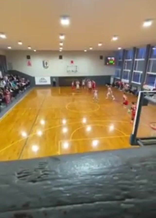 From an elevated perspective, a basketball game unfolds on a polished wooden court in a brightly lit gymnasium. Two teams, one in white and the other in red uniforms, are actively engaged in play. The camera is positioned behind a dark, weathered beam, providing a partial frame at the bottom of the view. Spectators are seated on bleachers along the left side of the court, watching the game intently. Natural light streams in through tall windows on the right side of the gym. A scoreboard displays the game information at the far end of the court, above the basketball hoop. The walls of the gym are adorned with a coat of arms and a sponsor's banner. An official is visible near the center of the court, monitoring the game.