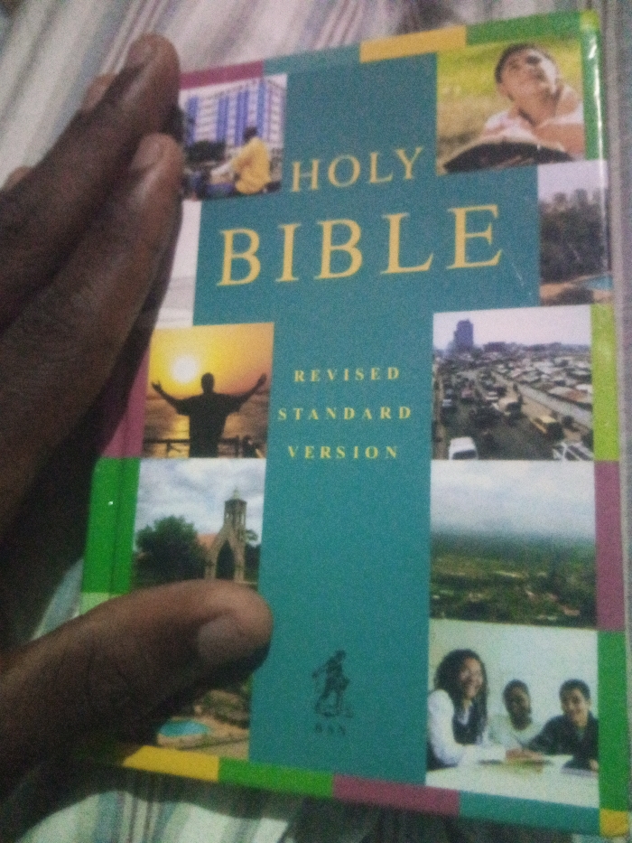 A hand holds a "Holy Bible" book, Revised Standard Version