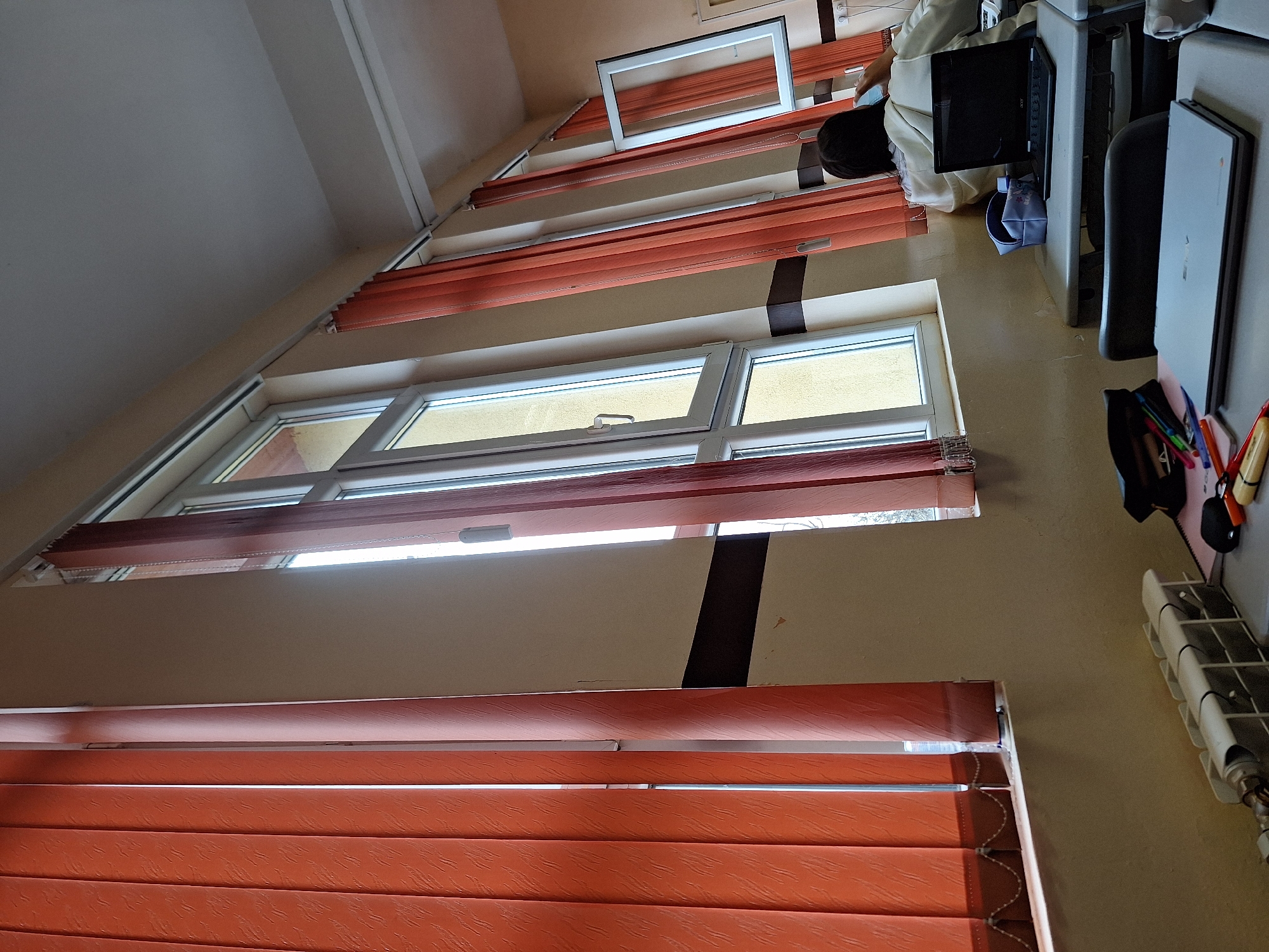 The image depicts an indoor scene within what appears to be an educational or training facility in Sofia, Bulgaria. The perspective is from the interior of a room, looking towards multiple large windows and an occupied desk area. The left side of the frame is dominated by three sets of vertical blinds, colored in a deep orange or terracotta hue with a visible textured pattern. These blinds partially obscure a multi-paned white PVC window, allowing glimpses of natural light and an exterior yellow-colored building facade. A white radiator is visible below the window in the bottom-left corner. The room's walls are painted a light beige or cream, featuring a horizontal dark brown stripe running across them at approximately mid-height. The ceiling is white and flat, with visible linear light fixtures. Towards the right and center-right, a series of additional white-framed windows are covered by similar orange vertical blinds, some of which are slightly open. A white-framed rectangular object, possibly a mirror or empty frame, hangs or leans against the wall in the upper-right quadrant, reflecting the orange blinds. White electrical outlets are visible on the wall beneath the windows. In the foreground, a grey desk holds a closed silver laptop (an ASUS Chromebook) to the left, alongside a black pouch, various colored pens and markers, and a small notebook. To the right of the silver laptop, a grey fabric organizer is present. Further into the room, on the right side, a person is seated at another grey desk. This individual is seen from behind, possessing dark hair and wearing a light-colored (off-white) garment. Their focus is directed towards an open black Acer laptop situated on the desk. The person's left hand is holding a mobile phone near their head, suggesting simultaneous interaction with both devices. A light blue fabric pencil case or organizer rests on this desk near the laptop. The chair for the foreground desk is black. The overall environment suggests a functional space intended for study or work, illuminated primarily by natural light entering through the windows.