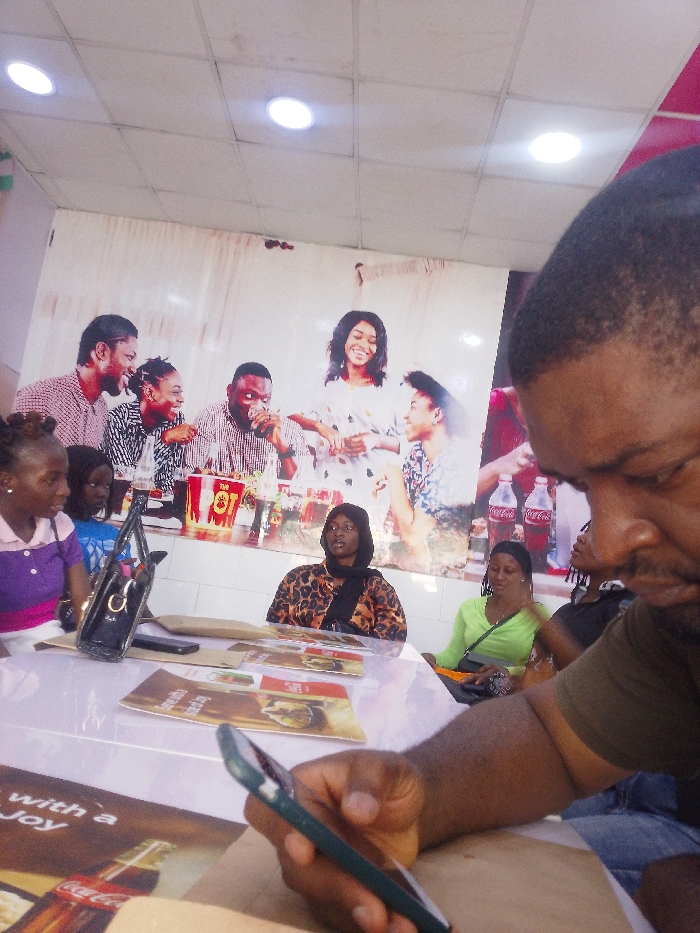 The image depicts an interior scene within a commercial establishment in the city of Giginyu, Nigeria. In the immediate foreground, the right side of a male individual's head and his right arm are visible; he has short dark hair and is looking down at a dark-colored smartphone held in his right hand. He wears a dark, possibly olive-green, top. Seated at a light-colored table, from left to right, are several individuals: a female with dark skin and braided hair wearing a purple and white top, looking to her left; partially obscured behind her, a young female in a blue top; a female with dark skin wearing a leopard-print long-sleeved top and a dark head covering, looking upwards and to the right; and a female with dark skin wearing a bright lime-green top and a black shoulder bag, looking forward. Another female in a dark top is partially visible to the far right. On the table are several paper items resembling menus or promotional placemats, some displaying "Coca-Cola" branding and food images. A black handbag and a second smartphone are also on the table. The background features a large wall mural depicting six smiling individuals (three males, three females) in a promotional context, surrounded by Coca-Cola bottles and fast food items. The ceiling is a white drop ceiling with two circular recessed light fixtures.