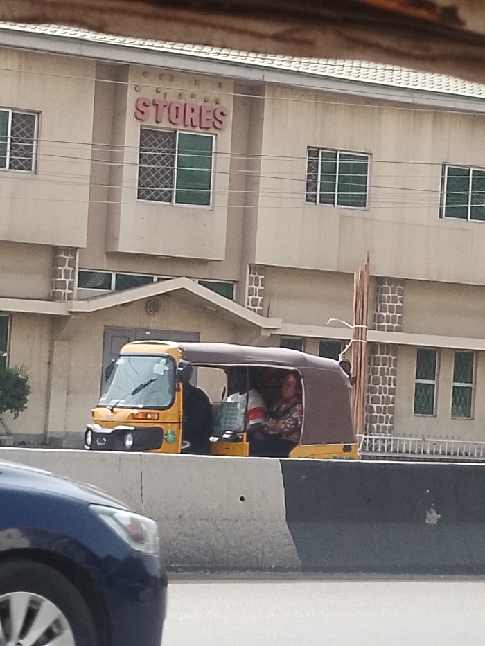 The image presents a street scene in Kawaji, Nigeria. In the mid-ground, a yellow and brown Keke Napep (auto-rickshaw) is observed moving on a paved road. It contains three occupants: a driver wearing dark clothing, a front passenger with a light-colored shirt holding a white object, and a female rear passenger wearing a patterned garment, who is smiling and facing forward. A concrete barrier, painted black and white on its top edge, separates the Keke Napep from the lower left foreground, which shows the front left quarter of a dark blue vehicle. In the background, a two-story commercial building with a light beige exterior stands under daylight. The building features multiple windows equipped with security grilles, some displaying green-tinted glass. The prominent red capitalized word "STORES" is affixed to the facade above the main entrance area, with smaller text "CELEBRE" visible above it. Decorative stone or brickwork details are present on the building's pillars. Several power or communication lines are horizontally stretched across the upper portion of the frame, in front of the building. To the right of the building's central section, a bundle of thin, vertical poles is tied together. Sparse green foliage is visible at the left base of the building.