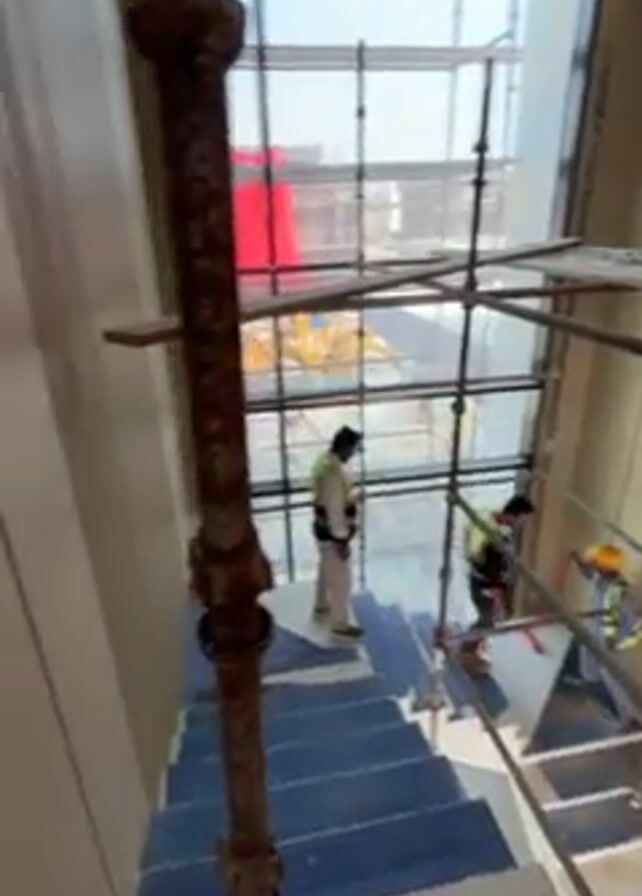 interior of a building under construction. The camera moves through a stairwell, where three workers in safety vests and hard hats are present. Scaffolding is erected along the stairs and in front of a large window. The stair treads are blue. Beyond the stairwell, a room is visible with a blue protective covering on the floor and a large sliding glass door leading to an outdoor balcony with a view of the city. The walls are white, and the room appears to be in the process of being finished. The building exterior is visible through the large window.
