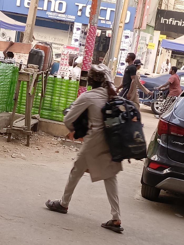 A street scene shows a man in a light-colored outfit and sandals walking away, carrying a large bag