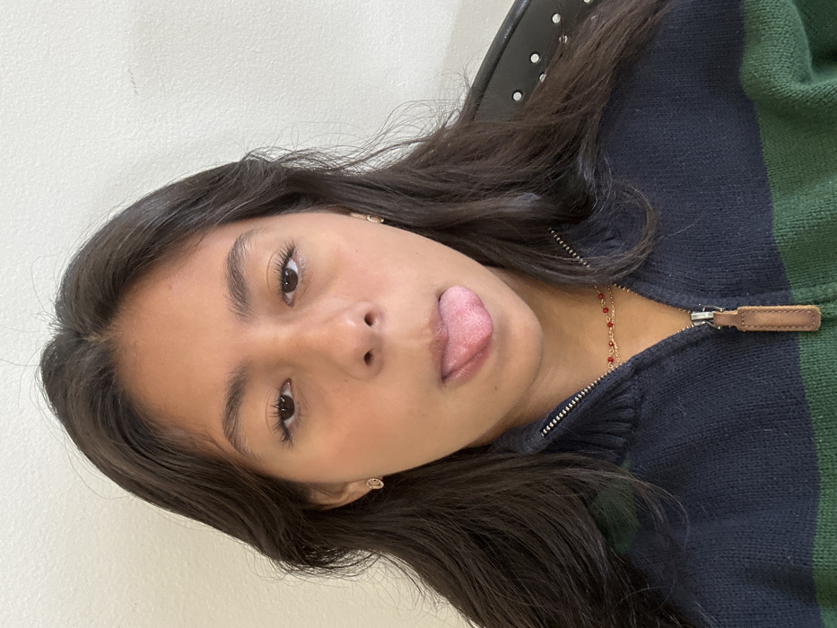 A young adult female is depicted in a close-up, frontal view, centered in the frame. She has long, dark brown hair parted in the middle, brown eyes, and a medium complexion. Her tongue is extended slightly from her mouth, and her gaze is directed forward toward the camera. She is wearing a quarter-zip sweater featuring horizontal stripes in navy blue and dark green. A brown, leather-like pull tab is attached to the zipper. Around her neck, a delicate gold-toned chain necklace with small red beads is visible. She wears small, light-colored stud earrings in both ears; the right earring is partially obscured by hair. The background consists of a plain, light-colored wall. A dark object with circular perforations, consistent with the back of a chair or seat, is partially visible on the right side of the frame. The lighting is even, indicating an indoor environment. The scene is stated to be located in Puebla City, Mexico; however, no specific geographic identifiers are discernible within the image itself.
