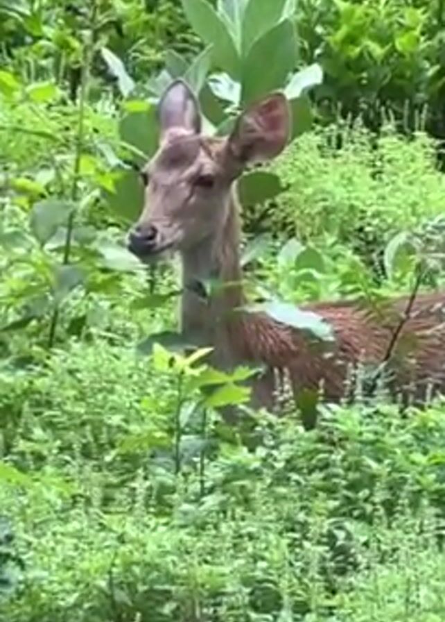 deer standing in tall green vegetation. The deer has a brown coat, large ears, and a dark nose. It looks directly at the camera with a curious expression. The surrounding foliage is lush and green, with a variety of plant types. The background appears to be a forest or wooded area. The video is stable and well-lit, providing a clear view of the deer and its surroundings.
