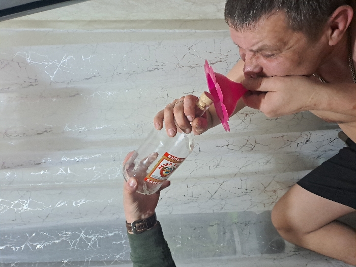 A shirtless man kneels, attempting to drink from an angled, mostly empty, clear bottle labeled "Russian Samogon." He uses a pink funnel connected to the bottle's cork. Another person is holding the bottle. The scene takes place on what appears to be a stone or marble surface. The man's face is contorted in an expression of effort. He is wearing black shorts.