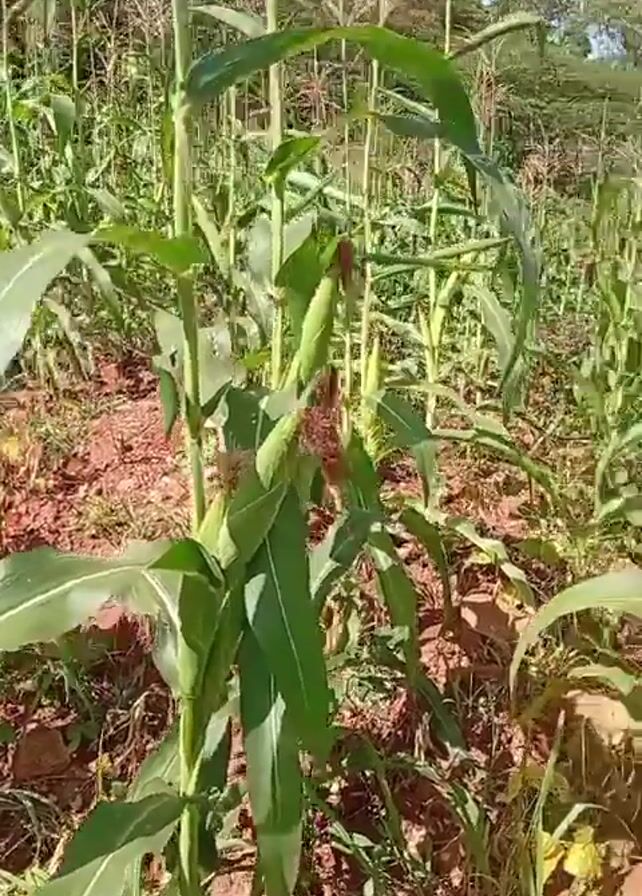 field of corn plants on a sunny day. The corn stalks are tall and green, and some have ears of corn growing on them. The ground is reddish-brown. Some trees are visible in the background. The video pans across the field, showing the density of the corn plants.