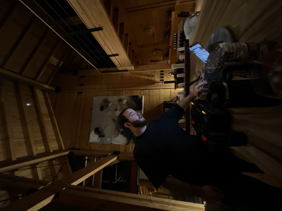 A man stands in a wood-paneled room with exposed beams. He's dressed in black and appears to be interacting with equipment, possibly a computer or sound system. The room features a painting and a wine rack mounted on the wall. A laptop sits on top of the equipment. The perspective is slightly tilted, emphasizing the angled walls and roofline.