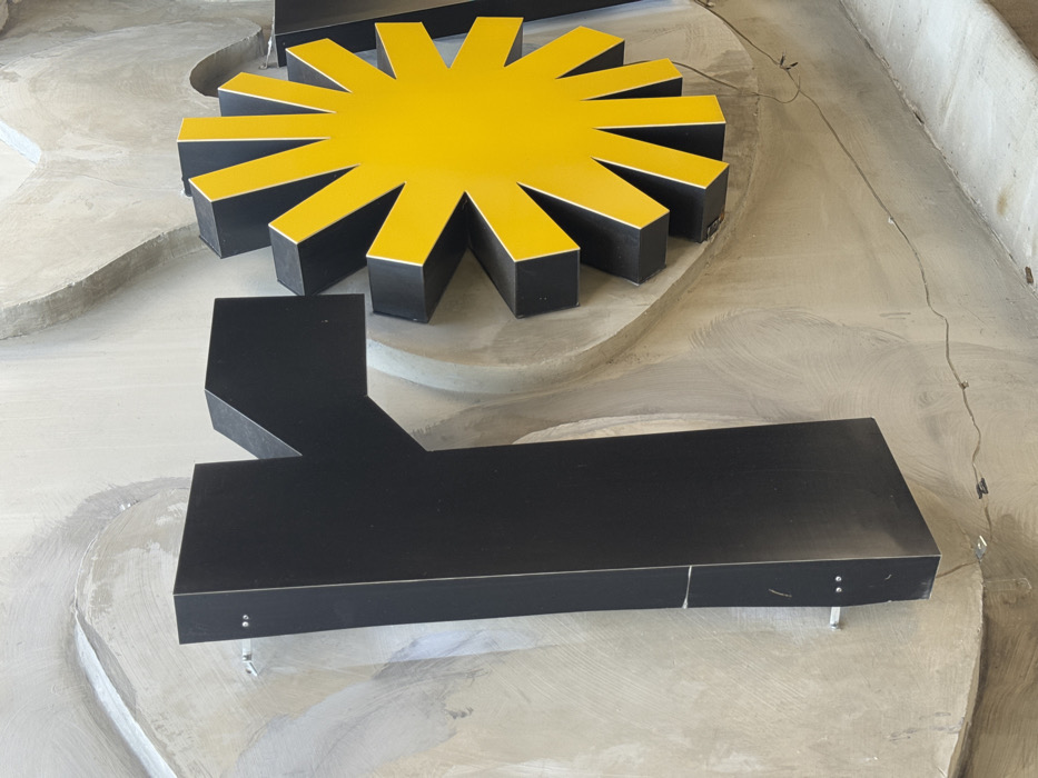 A three-dimensional commercial sign is affixed to a textured, light-colored wall in Cuernavaca, Mexico. The sign comprises two distinct elements: a large, black, lowercase letter "r" on the left, and a multi-pointed, yellow-faced, black-sided star or sunburst symbol on the right. Both components exhibit significant depth and are constructed from opaque materials. The letter "r" is secured to the wall by at least two visible metal fasteners positioned along its upper left vertical edge. Thin, dark-colored electrical wires are visible extending from beneath the right side of the sign components, running horizontally and then vertically downwards along the textured wall towards a concrete ledge at the bottom right. The wall surface displays an irregular, troweled or swirled finish, typical of stucco or concrete. No individuals or active interactions are present in the depicted scene.