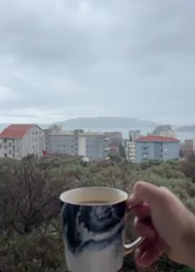 A first-person perspective shows a hand holding a mug of coffee in front of a cityscape on a cloudy day. The mug is white with blue and grey swirls and a gold handle. In the background, several buildings are visible, along with green trees and bushes. A body of water and a distant landmass are also visible under a grey, overcast sky.