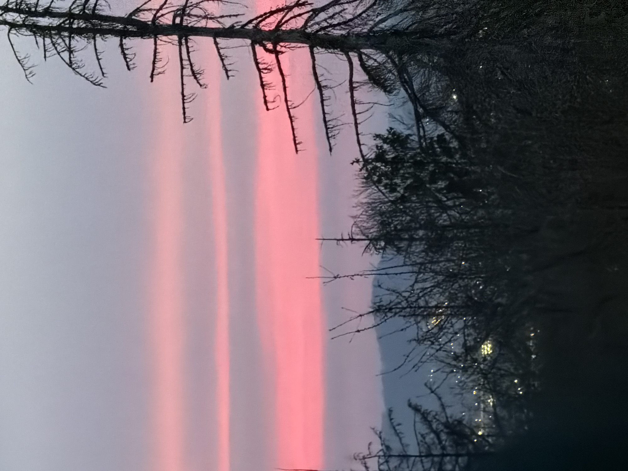 The image captures an outdoor scene at twilight or dawn overlooking Schifflange, Luxembourg. The sky in the upper two-thirds displays a gradient from muted grey-blue at the top to distinct, broad horizontal bands of vibrant pink and red across the mid-section, separated by a thinner grey-blue band. The foreground is dominated by dark, silhouetted trees and branches. A prominent, tall, slender, bare tree with sparse, downward-curving branches stands on the right, extending from the bottom into the pink sky. Additional dark, skeletal tree branches and smaller, denser evergreen silhouettes are visible in the lower left and center. In the distant midground, a faint, dark, undulating silhouette of hills or mountains is visible beneath the colorful sky. Below these hills, numerous small, scattered points of yellow and white artificial light indicate the urban sprawl of Schifflange. No individuals are present.