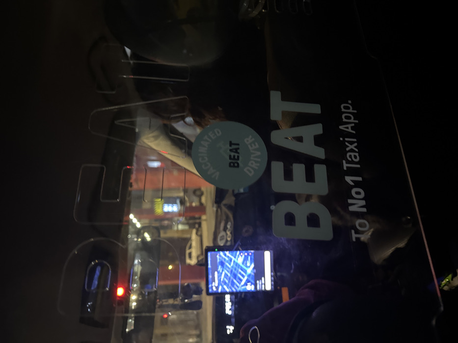 Inside a dimly lit BEAT taxi, a partition separates the passenger area. A sticker that reads "VACCINATED BEAT DRIVER" is on the partition. A device displays a map in the front, likely used for navigation. "BEAT To No. 1 Taxi App." is printed in large white letters. Outside the taxi, blurred lights suggest a busy urban environment.