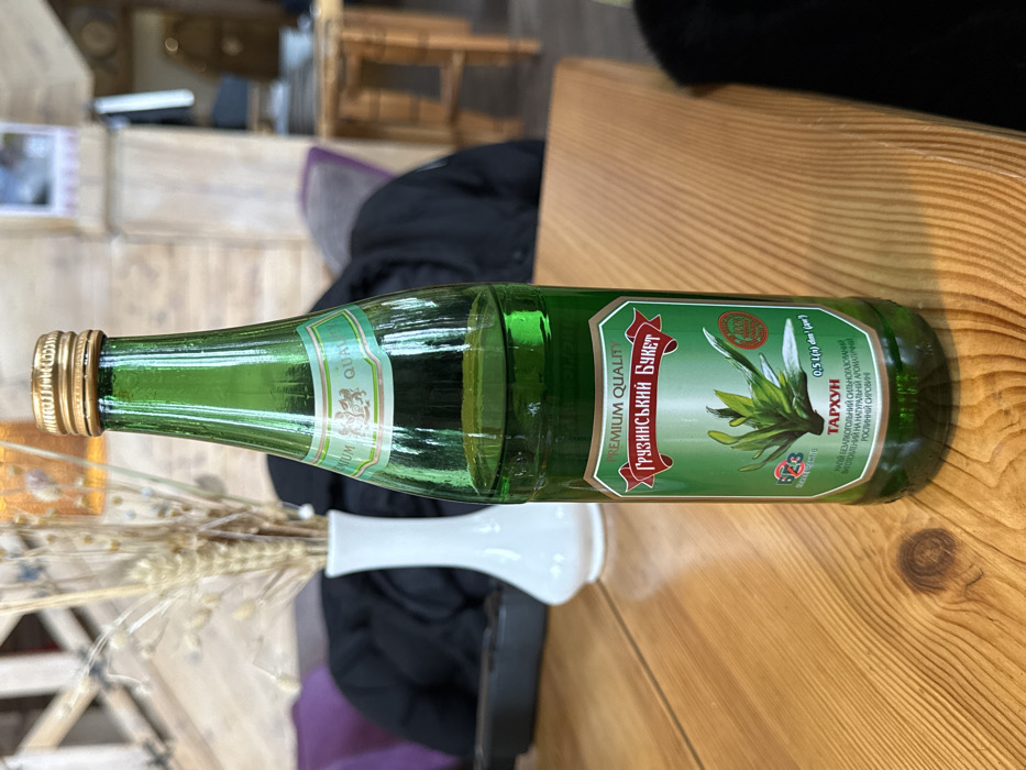 The image displays a 0.5-liter green glass bottle of "Грузинський Букет" (Georgian Bouquet) "Тархун" (Tarkhun) soda, positioned vertically on a light-colored wooden table. The bottle features a gold-colored screw cap and a green label with "PREMIUM QUALITY" text, "ГРУЗИНСЬКИЙ БУКЕТ" in red Cyrillic, and an illustration of tarragon leaves. The label also contains Ukrainian text, identifying the contents as a "highly carbonated non-alcoholic drink made from natural aromatic vegetable raw materials." To the left of the bottle, a white ceramic vase holds a bouquet of dried wheat stalks. The background is out of focus, revealing a dark garment draped over a purple upholstered seat and elements of light-toned wooden paneling or furniture, characteristic of an indoor commercial establishment such as a cafe or restaurant in Kyiv, Ukraine. No individuals are visible, and no actions or interactions are depicted.