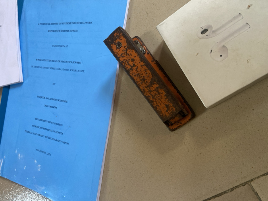 The image displays a technical report on student industrial work experience. The report was undertaken at the Kwara State Bureau of Statistics, located in Ilorin, Kwara State. It was authored by Roqeer, Salaudeen Kehinde, student ID 2021/1/5-4247PS, of the Department of Statistics, School of Physical Sciences, Federal University of Technology Minna. The report is dated November, 2005.
