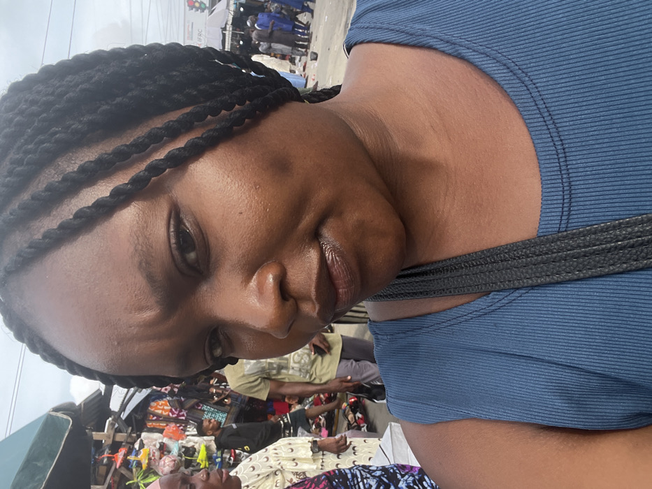 The image presents a close-up, front-facing view of a dark-skinned female individual, presumably a selfie, positioned outdoors within a bustling market environment in Lekki, Nigeria