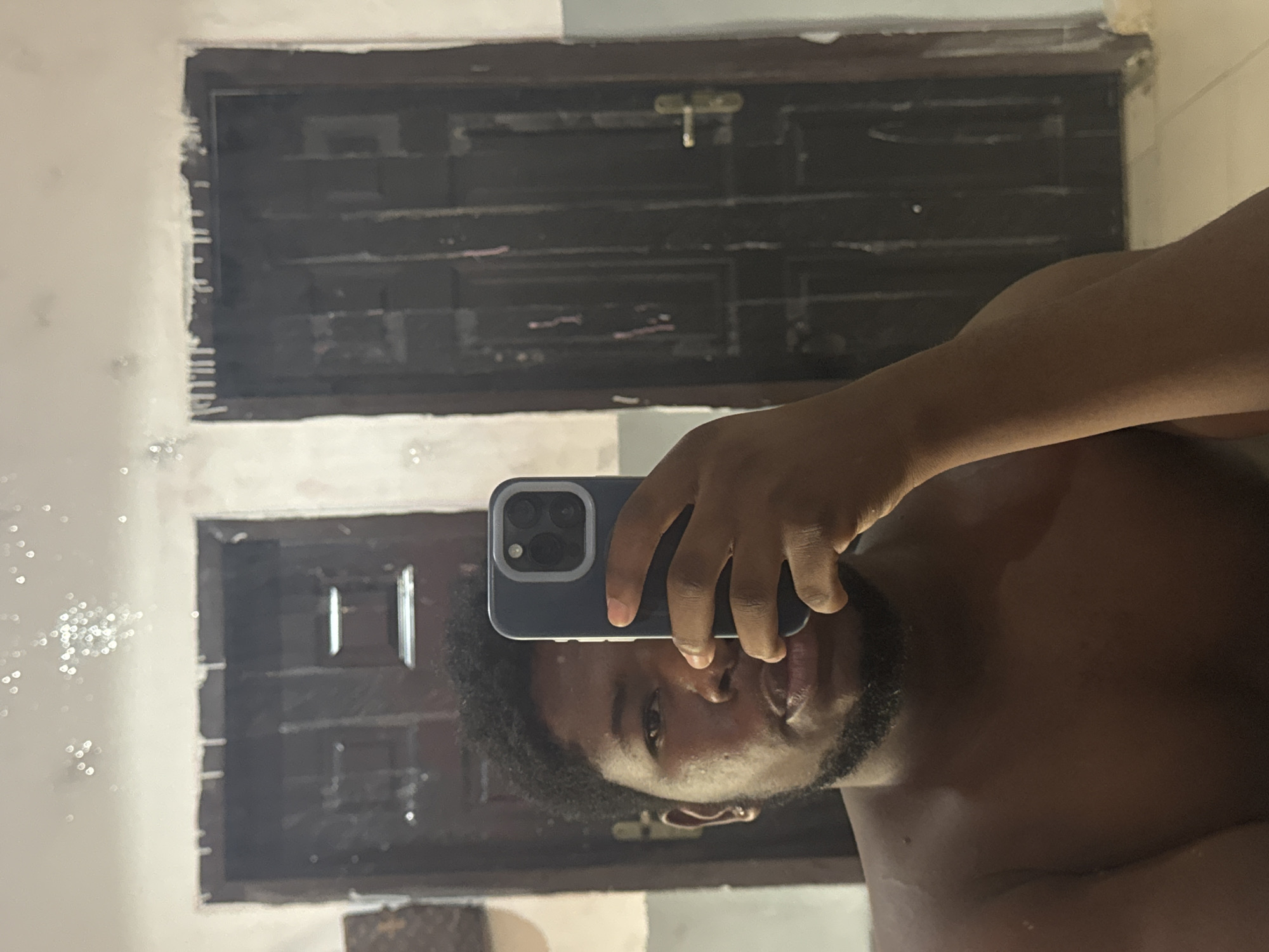 A dark-skinned, shirtless man is taking a selfie in a bathroom mirror. The reflection shows an unfinished wall and what appears to be dark-stained woodwork. The setting appears to be a bathroom with partially completed walls and surfaces. The location is unknown, but based on the prompt's request, it is likely somewhere in Ipetumodu, Nigeria.