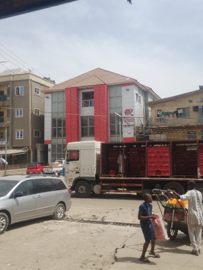 The image depicts a daytime street scene in Sabon Gari West, Nigeria, under a bright, overcast sky. In the foreground, a silver minivan is partially visible on the left, parked on an unpaved road surface. A white semi-trailer truck is positioned centrally, facing left, with its open cargo bed filled with multiple stacks of red plastic crates. A person in a light-colored garment stands within the truck's cargo area. To the right of the truck, two individuals are visible on the ground: a male in a light-colored garment stands beside a two-wheeled handcart loaded with items including yellow jerrycans, while a young boy in a blue shirt and shorts walks towards the cart, carrying a clear plastic bag containing packaged goods. The background features several buildings. Prominently in the center is a three-story building with a reddish-brown tiled roof, distinguished by white and red facade panels and large windows. A sign on its right side displays "Rilite" with a logo and smaller text possibly indicating "ULTRA MODERN HOTEL." To the left of this building is a taller, multi-story beige building with numerous windows. To the right, an older, two-story building features a balcony from which laundry hangs. Overhead, power lines are visible across the sky. The immediate ground in the foreground consists of uneven dirt and concrete sections.