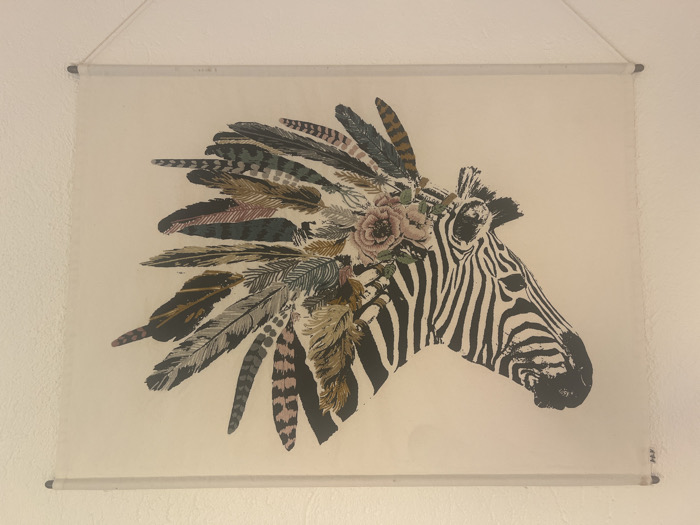 - "A zebra head print dons a feathered headdress" by FM-4CqV83, licensed under CC BY 4.0