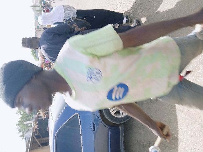The image depicts an outdoor street scene in Mumbwa, Zambia, under bright daylight. In the foreground, a young Black male is captured in motion, facing right. He wears a black beanie, a light green and white striped short-sleeve shirt with a blue circular logo and another emblem on the chest, and light-colored jeans. A piece of red fabric is visible near his right hip. He holds a light-colored wooden stick with a white and blue cylindrical object at its end in his right hand. The subject exhibits motion blur, indicating movement. To the left of the main subject, a dark blue sedan, possibly a Honda Accord, is parked or moving slowly. Further left in the background are rudimentary market stalls or buildings with light-colored walls and dark roofs. In the mid-ground to the right, behind the main subject, an adult male walks away from the camera, wearing a dark garment and a patterned kufi-style cap. Behind him, an adult female also walks away from the camera, wearing a white headscarf, a dark top with white patterns, and dark trousers or a skirt, carrying a dark handbag on her right shoulder. Additional blurred figures are visible further in the background, suggesting a moderately crowded area. The ground surface is unpaved, appearing as dirt or gravel.