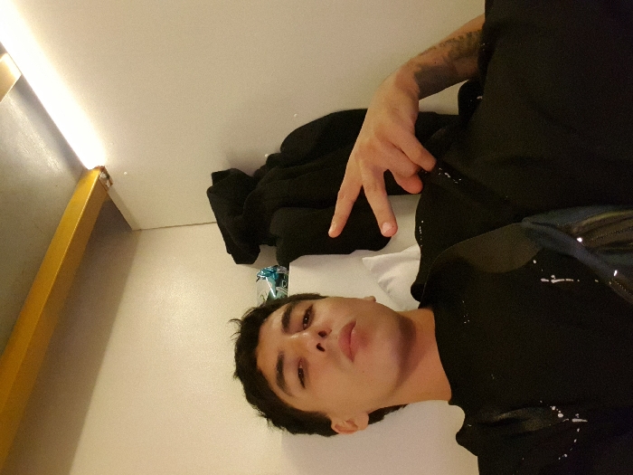 A person lies on a white bed in a room. They wear a black shirt, jacket, and pants. The person's left arm extends upward, displaying a two-finger gesture. A drink and a dark garment rest nearby. The room features a gold-colored accent. The person appears relaxed in a candid snapshot.