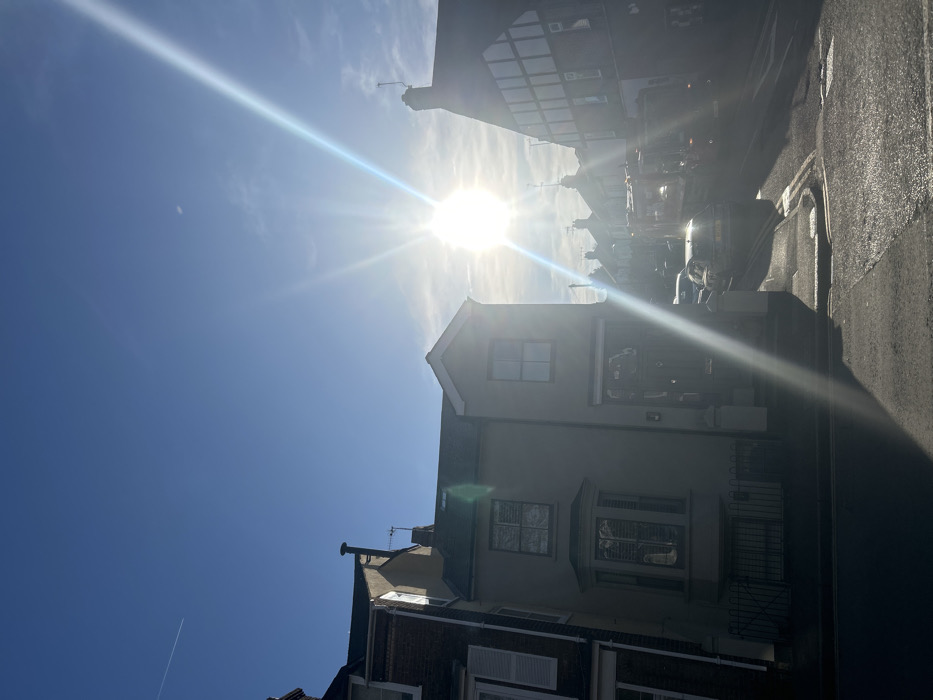 This image depicts a street scene in a built-up area consistent with a town within Dacorum, United Kingdom, under a clear blue sky with a low sun angle, suggesting either morning or late afternoon. In the foreground, an asphalt road surface reflects sunlight, displaying pronounced shadows. To the immediate left, a portion of a brick building with visible white window shutters is present. Adjacent to it, centrally positioned, is a light-colored, two-story house. This house features a ground-floor bay window fitted with internal vertical blinds and an upper-story window containing a patterned covering. A recessed dark front door is located on the right side of its facade, which also has a gabled section. A low black metal fence encloses a small area in front of the ground floor. Further down the street on the right, a traditional British building with half-timbered upper stories and a dark tiled roof is prominent. The street continues into the background, lined with additional residential structures. Multiple vehicles are parked or positioned along the right side of the street, including a dark sedan and a large red vehicle, possibly a fire engine, partially visible towards the distant end of the road. The bright sun, located in the upper right quadrant of the sky, generates a strong lens flare that traverses the image diagonally. A faint aircraft contrail is visible in the upper left sky. No people are discernible within the frame.