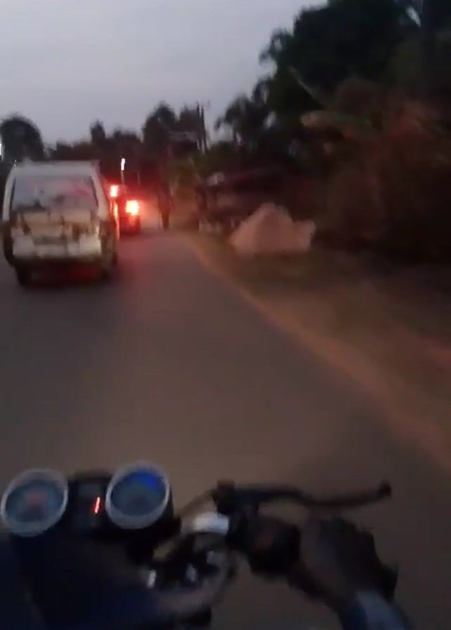 perspective of someone riding a motorcycle down a narrow road at dusk or dawn. A white van with red taillights is ahead, driving in the same direction. A person walks along the right side of the road, and there are houses and trees along the roadside. The sky is overcast.