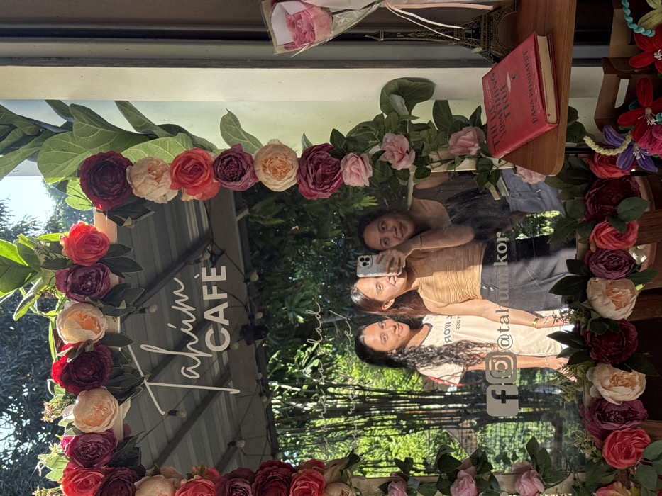 An image captured in Koronadal, Philippines, depicts a reflection of three women in a large mirror or window, framed by an arch of artificial flowers in shades of red, pink, cream, and maroon. The central woman holds a light-colored smartphone, taking a selfie, partially obscuring her face. To her left, a woman with long dark hair smiles, wearing a light t-shirt. To her right, a woman with shorter dark hair also smiles, wearing a dark sleeveless top. Reflected above the women, the name "Tahúm CAFÈ" is visible in white script and block letters. Below this, partially legible text states "Welcome, dalád / You are home!". Social media icons for Facebook and Instagram, along with the handle "@tahumkor", are also reflected. The background, seen through the reflection, features lush green foliage, possibly bamboo, and string lights, indicating an outdoor or semi-outdoor setting with natural sunlight. To the right of the reflection, on a wooden surface, a red-covered book titled "TELL ME SOMETHING TRUE" by Dana Reinhardt is placed next to a miniature bronze Eiffel Tower statue. A small bouquet of pink flowers, wrapped in clear plastic, is partially visible further to the right.