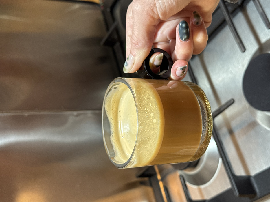 An indoor image taken in a kitchen within Pancharevo, Bulgaria, depicts a right hand grasping a clear glass mug by its black, circular handle. The mug contains a dark brown liquid, consistent with coffee, topped with a thick layer of lighter brown crema. The visible fingernails on the hand are manicured and feature a multi-colored polish pattern incorporating shades of green, dark grey, and mottled brown. The mug is positioned above a stainless steel gas stovetop with black burner grates visible in the foreground. A brushed stainless steel panel forms the background.
