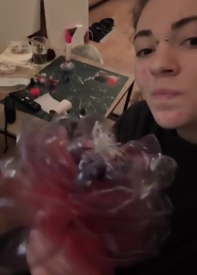 person holding and rotating a red, flower-shaped object made of transparent plastic. The person is fair-skinned with brown hair pulled back, wearing a black shirt. The background shows a messy room with a wooden floor. There's a table covered with a green cutting mat and various crafting supplies such as paint, brushes, and scissors. Other objects in the room include a cabinet, boxes, and general clutter. The camera remains mostly static, focusing on the object and the person's face.