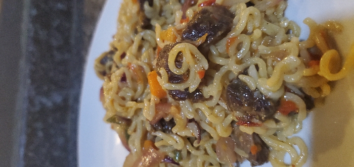 - "A close-up shot displays a plate of noodles, possibly ramen, mixed with vegetables and chunks of what could be mushroom or meat" by FM-JwA7r1, licensed under CC BY 4.0