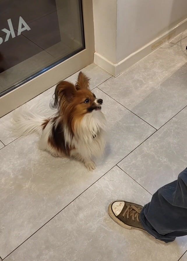 A close-up video shows a Papillon dog sitting on a white-tiled floor. The dog is primarily white with brown markings, long, flowing ears, and a happy expression with its tongue slightly out. It looks upward, presumably at the person holding the camera. A foot in a grey pants leg and an olive green sneaker is visible near the bottom right of the frame. Behind the dog is a glass door with partial lettering in a foreign language. To the right of the door, a white wall with a small sign is partially visible. The environment appears to be indoors, possibly a store or office space.