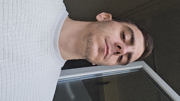 The image depicts a male individual, observed from a low-angle perspective, located in Burgas, Bulgaria. The subject, an adult male, possesses short, dark brown hair, prominent eyebrows, and visible stubble on his chin and cheeks. His ears are slightly prominent. He is wearing a light-colored, possibly white or off-white, crew-neck long-sleeved garment featuring a distinct quilted, square-patterned texture. His gaze is directed upwards towards the camera. The background to the subject's left is a dark, uniform surface. To his right, a partial white window or door frame is visible, enclosing a glass pane. The glass reflects light and obscures the exterior, revealing only dark tones and a faint, indistinct lighter shape within the reflection. The scene suggests an interior or enclosed outdoor setting, such as a balcony.