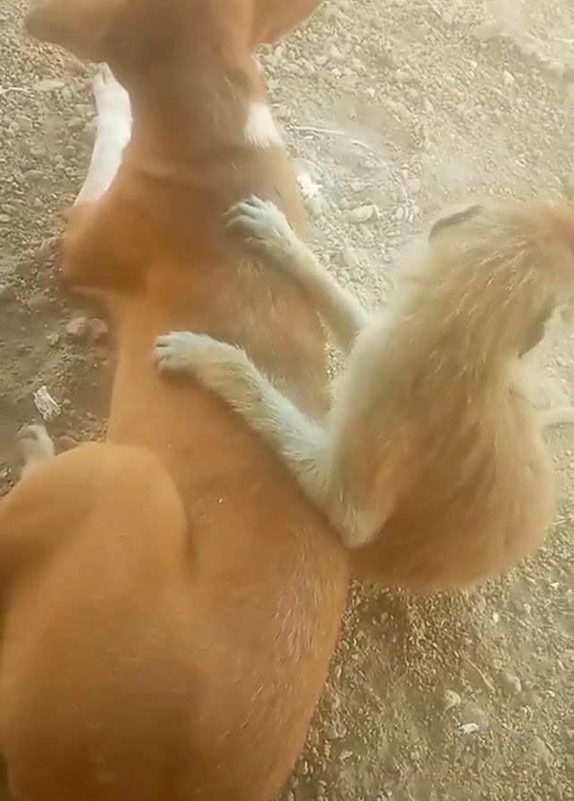 A monkey sits on a dog's back outdoors. The dog lies down, facing away from the camera. The monkey sits facing the same direction, with its arms on the dog's back. The environment consists of dirt and some debris. The video is shot from above.