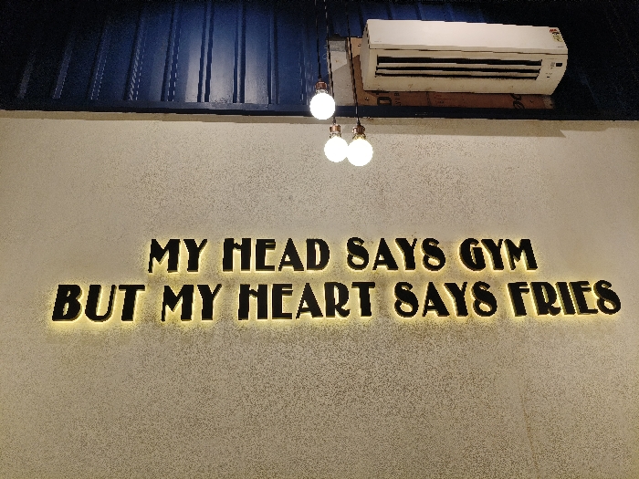 The image displays an interior wall scene within an establishment located in Kolkata, India. The upper portion of the wall consists of a dark blue, corrugated metal or paneling surface, while the lower section is a textured, light-colored (off-white or light gray) plastered wall. Centrally positioned on the lighter wall is a luminous, three-dimensional sign displaying the quote "MY HEAD SAYS GYM BUT MY HEART SAYS FRIES" in dark, block letters with a warm yellow backlighting effect. Above the sign, to the left, three spherical light bulbs with visible filaments hang suspended from dark wires, emitting warm light. To the right, mounted on the dark blue corrugated section, is a white horizontal split-unit air conditioner, positioned on a rectangular light brown backing board. No individuals are present in the scene, and no actions or interactions are depicted.